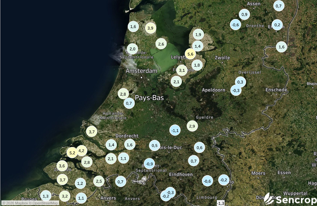 Si une légère baisse de la quantité de fruits s’observe, la qualité de la cueillette s’annonce d’ores et déjà bonne… et ce malgré de nombreuses gelées printanières (voir la carte ci-dessous montrant les températures minimales relevées sur le pays par notre réseau de stations météo le 12 mai 2020). La mi-mai avait en effet été marquée par des conditions calmes et froides, entraînant des gelées nocturnes tardives. La floraison était alors déjà en cours, tout comme dans les vergers de l’Hexagone, d’où les dégâts localement observés dans le fond des vallées (plus sensibles au gel radiatif). L’été a été marqué par une sécheresse estivale remarquable ! A titre d’exemple, entre le 28 juillet 2020 et le 12 août 2020, il est en moyenne tombé moins de 5 millimètres (ou litres / mètre carré) de pluie dans la région de Rotterdam. Le soleil généreux du mois d’août a quant à lui permis d’améliorer le goût et la texture de la récolte.