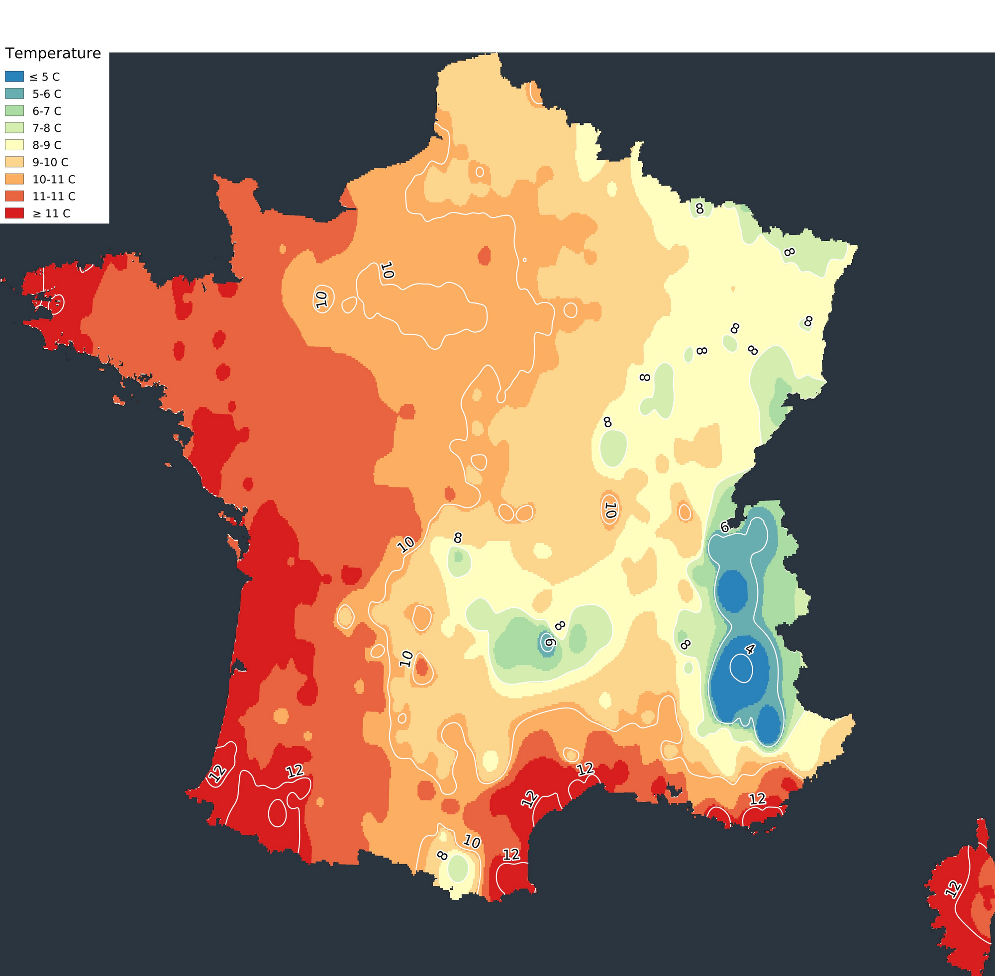 carte France Sencrop - moyenne des températures du 24 décembre au 31 décembre 2021