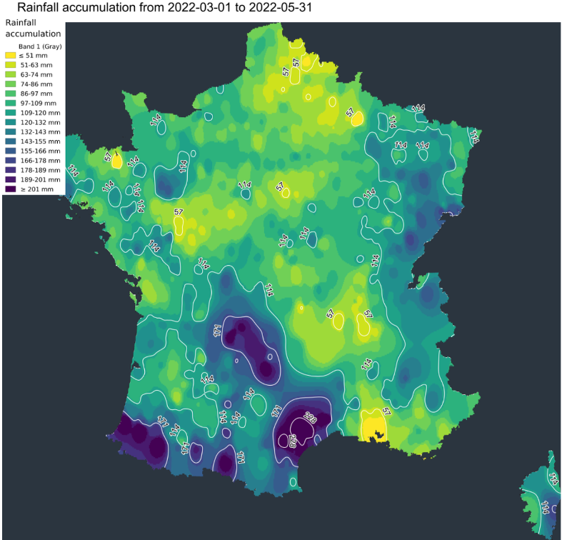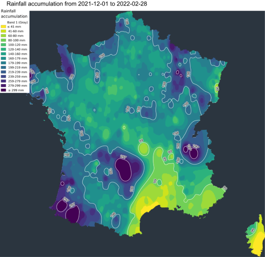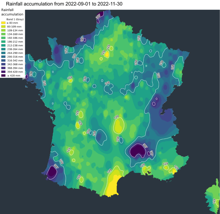 De son côté, l’ensoleillement a été plus proche des normales, grâce au retour de pluies parfois importantes sur le territoire. Pas assez cependant, pour effacer la sécheresse installée depuis des mois sur une grande partie du territoire. D’une région à l’autre, on assiste ainsi à un grand écart dans les données publiques de Météo France. L’excédent de pluies atteint parfois les 10 à 50% entre Bretagne et Alsace, mais les pluies restent déficitaires plus au sud, notamment sur les côtes méditerranéennes avec un manque d’eau atteignant parfois les 50% par rapport aux normales. Parmi les 20 000 stations météo Sencrop installées en France métropolitaine, les cumuls de pluies sur la saison atteignent ou dépassent parfois les 400mm, (principalement en Bretagne et dans les Hauts-de-France), mais restent inférieurs à 100mm pour de nombreuses stations installées sur les bords du Golfe du Lion.