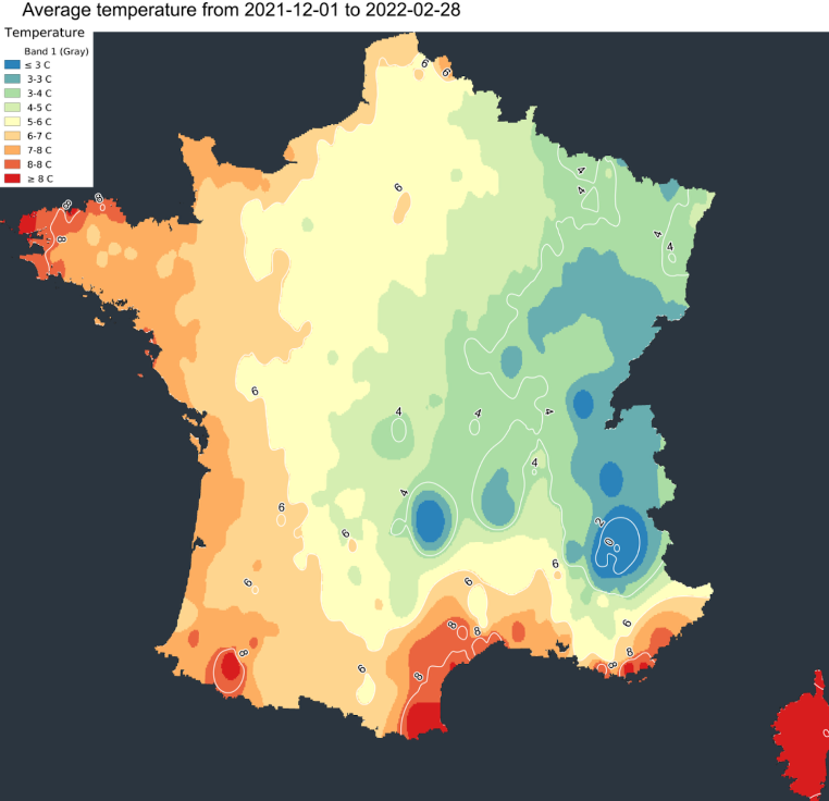 L’info en + : alors que la douceur et les conditions anticycloniques dominent la France depuis plusieurs semaines, on constate un retour tardif et temporaire de l’hiver entre le 1er et le 5 avril. On observe des températures descendant jusqu’à -5°C sur le réseau Sencrop installé en Champagne-Ardennes. Des records de froid sont battus et les flocons de neige sont observés jusqu’en plaine dans plusieurs régions. Quelques jours après, entre le 8 et 9 avril, c’est une tempête qui touche les régions situées entre l’arc Atlantique et la plaine d’Alsace avec de fortes rafales de vent.