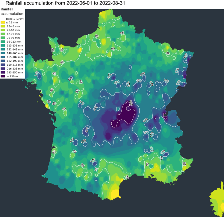Les précipitations ont par ailleurs été déficitaires en moyenne de 40 à 60% sur la France. Ce déficit atteint des valeurs encore plus élevées dans certaines régions du centre de la France, mais aussi à proximité des frontières de l’extrême nord du pays.
