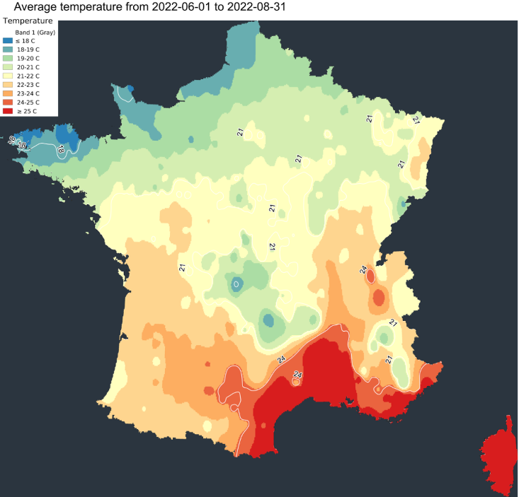 Les températures relevées durant la période juin-juillet et août ont été exceptionnelles. Au total, 3 vagues de chaleur ont été enregistrées en France durant cet été remarquable (entre le 15 juin et le 19 juin, du 12 au 25 juillet, puis entre le 31 juillet et le 13 août). L’ensemble des régions françaises ont été touchées et de nombreux records de chaleur sont battus. Il s’agit alors d’une période compliquée pour les humains, les bêtes, mais aussi la végétation. Le 18 juin dernier, la trentaine de stations de référence de Météo France (permettant de délivrer une moyenne nationale de température), indique une température maximale moyenne sur le territoire de 36,6°C. « C’est un record absolu tous mois confondus », communiquent à l’époque, les experts météo. Sur le réseau Sencrop, les stations météo surchauffent avec des pointes jusqu’à 43°C relevés dans les plaines de Nouvelle-Aquitaine. Au nord de la Loire, on suffoque aussi avec des températures affichant de 36 à 39°C entre les côtes de la Manche et les frontières allemandes. C’est ainsi que l’été 2022 se classe à la deuxième place des étés les plus chauds jamais enregistrés dans le pays depuis le début des relevés météorologiques.