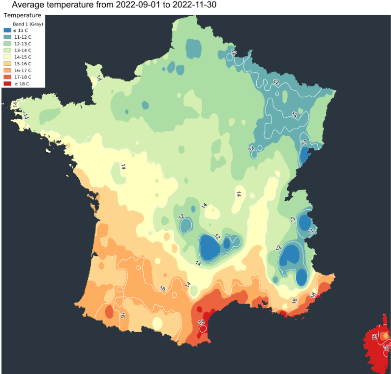 Cette saison suit le même chemin que les 3 précédentes. Les températures sont restées de septembre à novembre largement au-dessus des normales de saison sur la totalité des régions, à quelques exceptions locales. Durant cet automne, des records de chaleur tombent encore. Le 12 septembre dernier, on relevait 40.2°C sur la commune de Pissos (Landes). Cette valeur constitue un nouveau record mensuel national. Les températures atteintes feront de cette saison l’automne le plus chaud jamais enregistré en France avec une température moyenne nationale située à +2.1°C au-dessus de la normale.