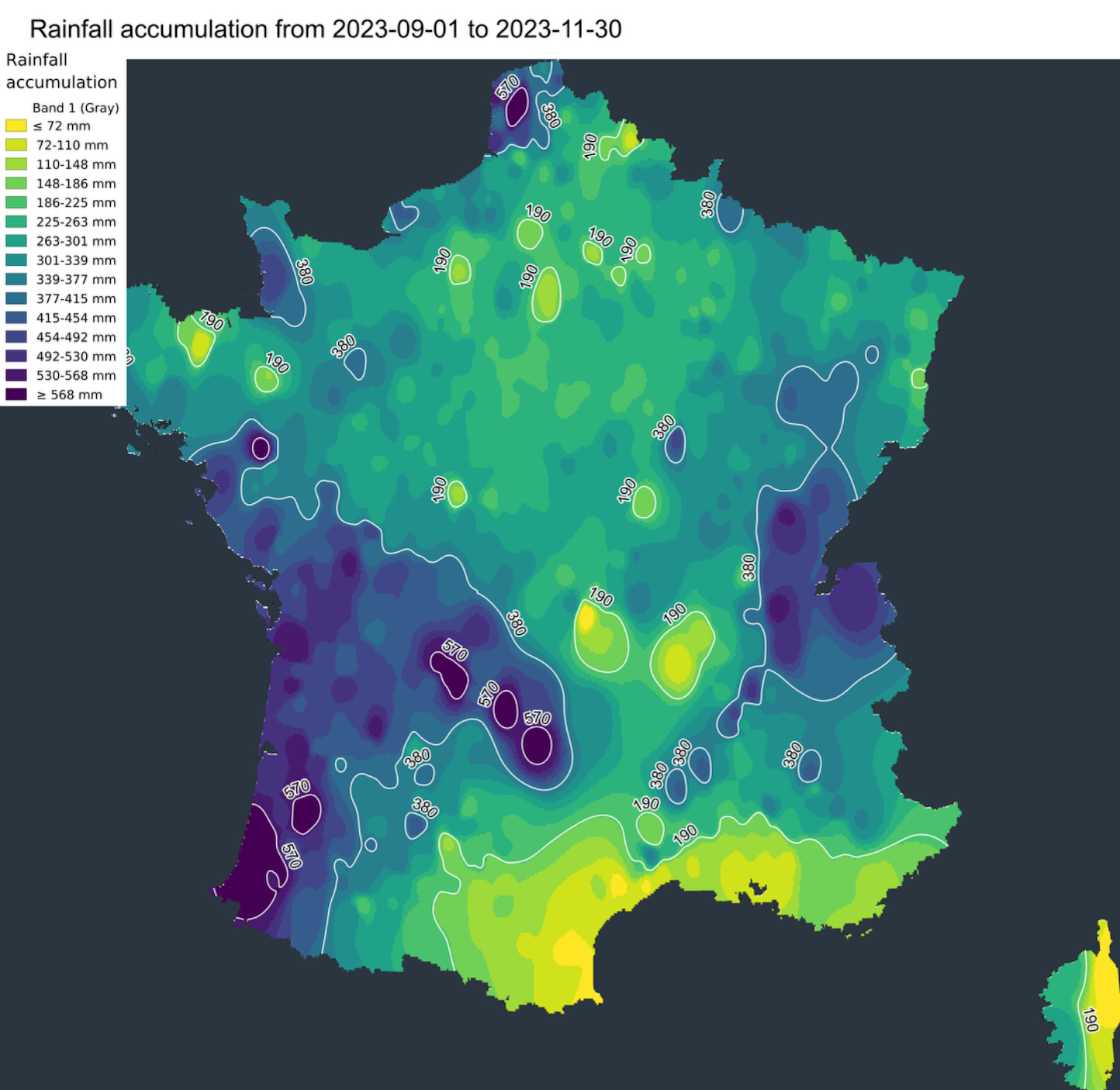 Côté précipitations, là-encore, le temps est resté très sec sur les premières semaines de l’automne avant un retour fracassant de perturbations à la mi-octobre. Des pluies répétées, souvent soutenues, se sont échouées, entraînant rapidement des inondations. De très nombreuses régions ont ainsi été concernées : Bretagne, Nord-Pas-de-Calais, Pays-de-la-Loire ou encore Rhône-Alpes. Les précipitations ont été remarquables dans le Pas-de-Calais : il est tombé l’équivalent de 3 à 4 mois de pluie en seulement 3 semaines sur la partie Ouest du département. À l’échelle de la France, on relève un excédent général de précipitations permettant enfin aux nappes phréatiques de retrouver un niveau satisfaisant sur une très large majorité des régions. Cette saison sera marquée par le passage de la tempête Ciaran, notamment entre la Bretagne et la Normandie. Les rafales ont parfois dépassé les 170 km/h sur les côtes.