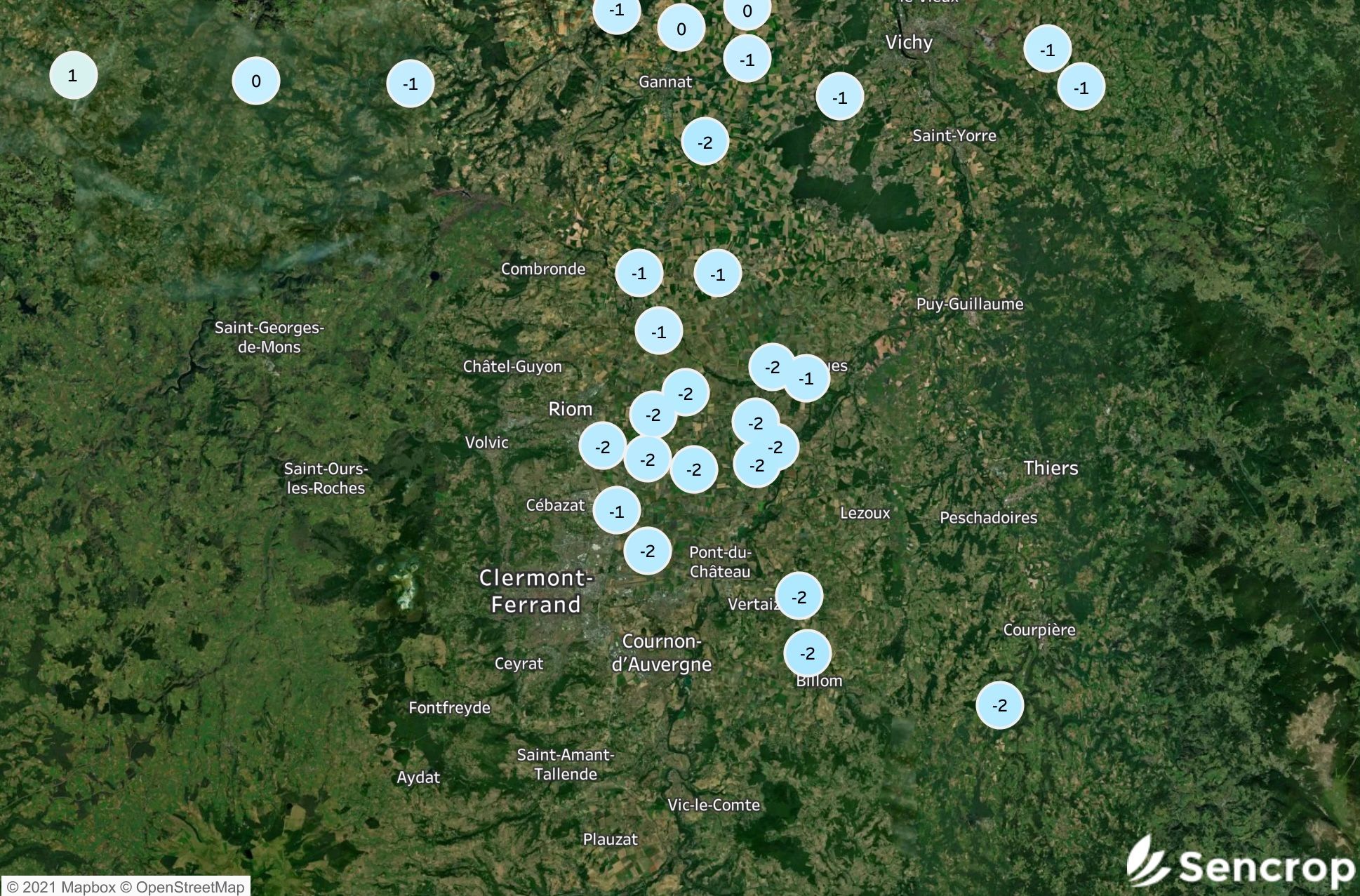 Si les derniers jours ont offert des températures minimales souvent inférieures à 0°C le matin, le thermomètre a parfois eu du mal à grimper dans la journée. En Auvergne, le mercure est resté durant 4 jours consécutifs inférieur à 0°C. Pour retrouver un tel enchaînement, il faut remonter à février 2012 à Clermont-Ferrand (Puy-de-Dôme) d’après les données de Météo France. Dans une région entourée de montagnes et habituée au froid, il devient de plus en plus rare d’observer plusieurs journées sans dégel à la suite. Sur cette carte des stations météorologiques Sencrop installées dans la région, on observe que la température maximale enregistrée entre le 18 et 21 décembre est restée autour des -1 à -2°C en journée.