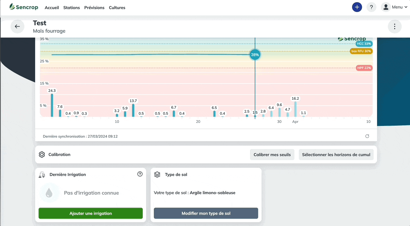 Enfin, calibrez vos seuils d'humidité : Humidité volumique à la Capacité au Champ (HCC), bas de la Réserve Facilement Utilisable (bas RFU) et Humidité au point de Flétrissement (HPF). Des seuils prédéfinis sont disponibles en fonction de votre type de sol. Si vous souhaitez les modifier en fonction de vos besoins, nous vous invitons à faire appel à un technicien ou à un expert.