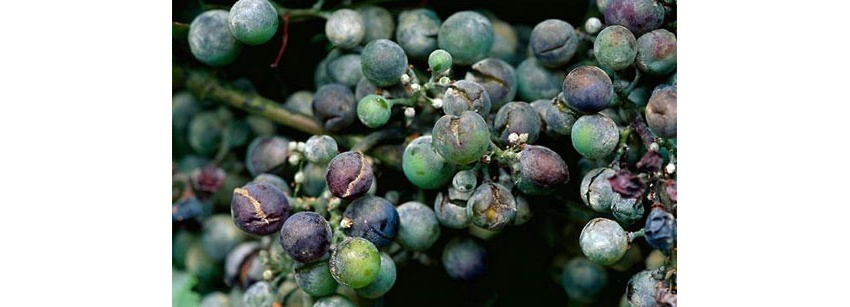 Pour l’oïdium, maladie provoquée par Erysiphe necator, les dommages entraînent une diminution de l’activité photosynthétique qui pourra se traduire par une augmentation des composés phénoliques dans le raisin ainsi que des verdeurs prononcées. De plus, une attaque sévère d’oïdium réduit la capacité de la plante à faire des réserves pour l’année suivante et complique l’aoûtement. Enfin, cette maladie peut être une porte d’entrée pour des contaminations de Botrytis. Ce champignon passe l’hiver dans les bourgeons, sous forme de conidies (forme asexuée) et sous forme de cléistothèces (forme sexuée) dans les bois. Ces dernières maturent et s’ouvrent, laissant place à des ascospores qui colonisent les tissus verts.