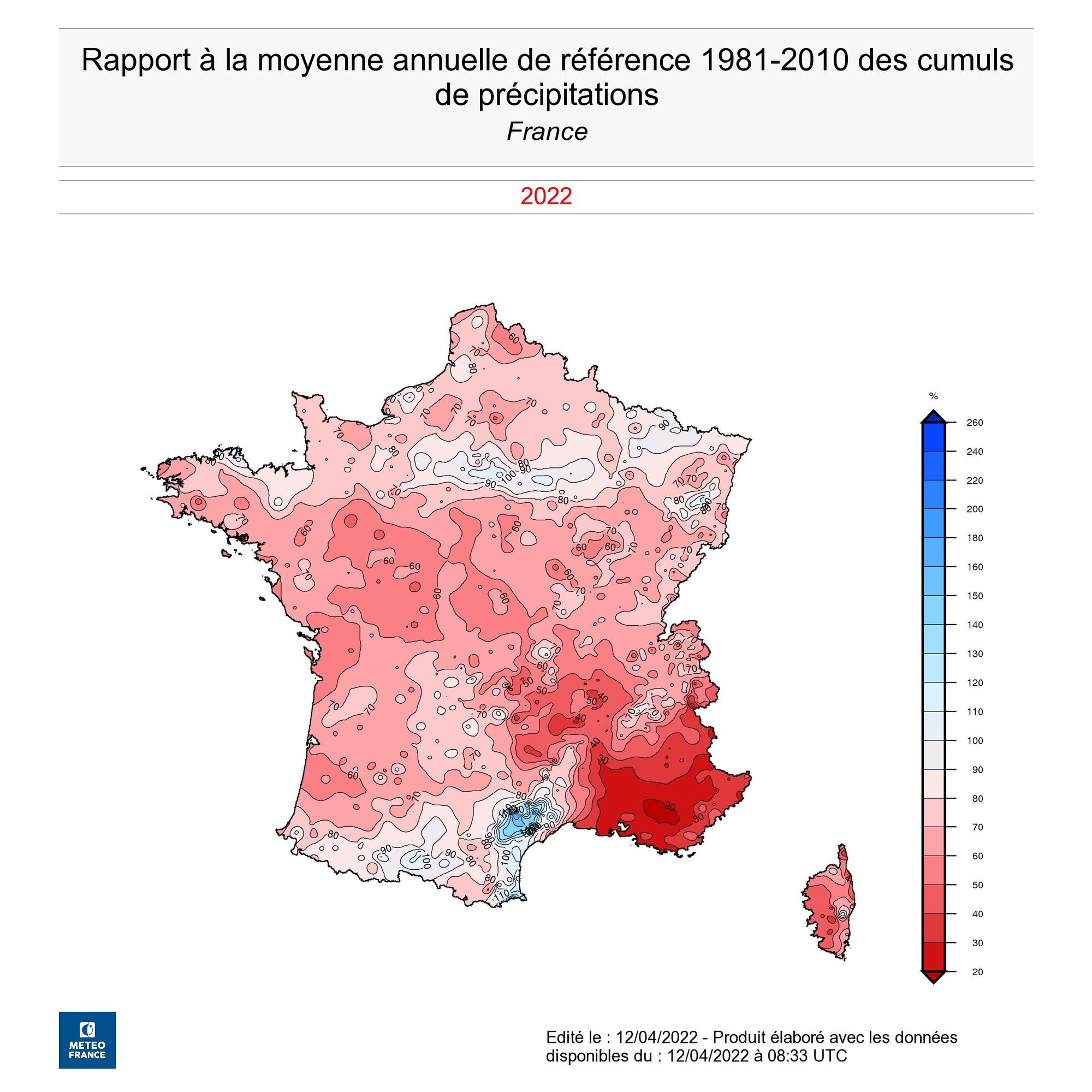 « Il n’a jamais aussi peu plu à l’échelle de la région Provence-Alpes Côte d’Azur sur la période allant du 1er janvier au 11 avril », confirme Météo France. Le rouge vif, apparaissant ci-dessous sur la carte, met en évidence un manque d’eau marqué sur les bords de la Méditerranée depuis le début de l’année. D’autres régions sont également concernées par l’absence des pluies, sans toutefois atteindre des niveaux records. C’est tout un territoire qui souffre depuis l’été dernier du manque d’eau.