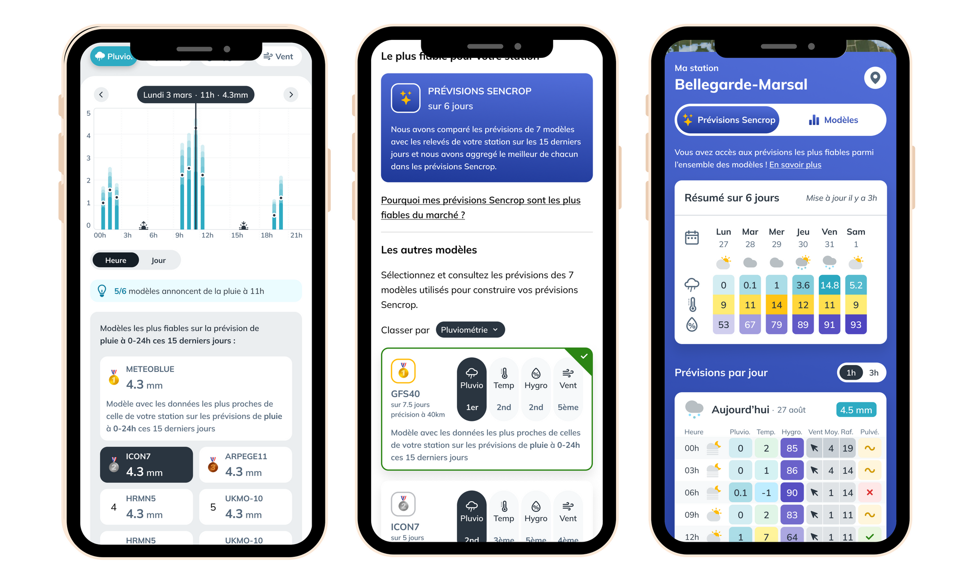 Écrans de visualisation des nouvelles fonctionnalités : Comparateur de prévisions - Classement des modèles - Prévisions Sencrop (de la gauche vers la droite)