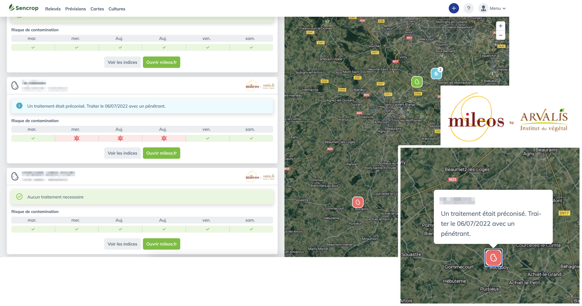 En se basant sur les relations existant entre les deux structures depuis 2017, Sencrop a intégré Mileos dans son interface dès la saison 2022 : les producteurs pourront entrer leurs informations (variété, date de plantation, date de levée, date de pulvérisation, …) et visualiser leurs risques mildiou directement dans l’application Sencrop. Désormais, les agriculteurs peuvent gérer le risque mildiou directement dans l’application Sencrop. En 2022, déjà près de 1.000 producteurs, via leurs groupements (coops, négoces, CETA, ...), ont profité de cet abonnement couplé Sencrop x Mileos.